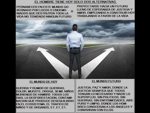 ES LA ÚNICA POSIBILIDAD PARA QUE PUDIERAIS ALEJAROS DE VUESTRO DEMENTE PROYECTO DE AUTODESTRUCCIÓN. ESTAREIS OBLIGADOS A DIRIGIR TODOS VUESTROS PENSAMIENTOS, VUESTRA TECNOLOGÍA MILITAR Y CIVIL PARA SOSTENEROS DE LOS GOLPES MORTALES QUE PRONTO LA NATURALEZA PROVOCARÁ AL GÉNERO HUMANO. NO SE EXCLUYE UNA OLA, AÚN MÁS FUERTE, DE UN VIRUS MÁS POTENTE QUE AQUEL QUE VOSOTROS HABEIS DEFINIDO COVID 19.