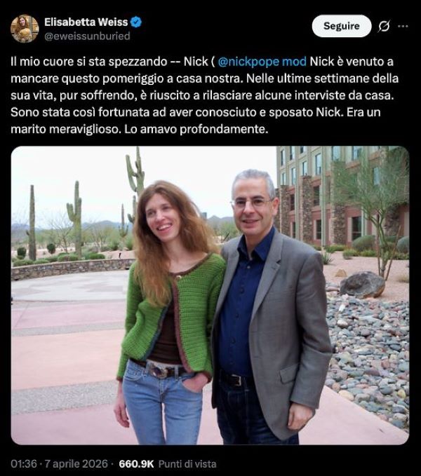Ayer, 7 de abril de 2026, Elizabeth Weiss, esposa del conocido ufólogo británico Nick Pope, publicó la noticia del fallecimiento de su marido, ocurrido a la edad de 61 años en Tucson, Arizona, el día anterior, 6 de abril de 2026.