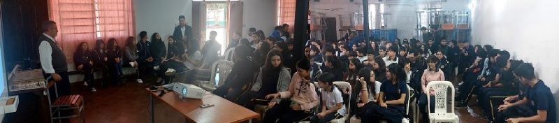 El Director se excusa no poder participar por tener una reunión importante, y empezamos a desarrollar la charla, en un ambiente totalmente educado y con mucho interés y atención de parte de los alumnos, nos damos cuenta que muchos con sus celulares estaban fotografiando las imágenes que presentábamos en el desarrollo de la misma, pero había quienes estaban grabando partes de la charla o trasmitían algunos a sus padres, (nos enteramos a la tarde de esta situación) al final dimos las gracias por su atención, y un estruendo aplauso se sintió en la sala como demostrando la aceptación de todo lo que compartimos con ellos en la charla que siempre es Audio Visual.