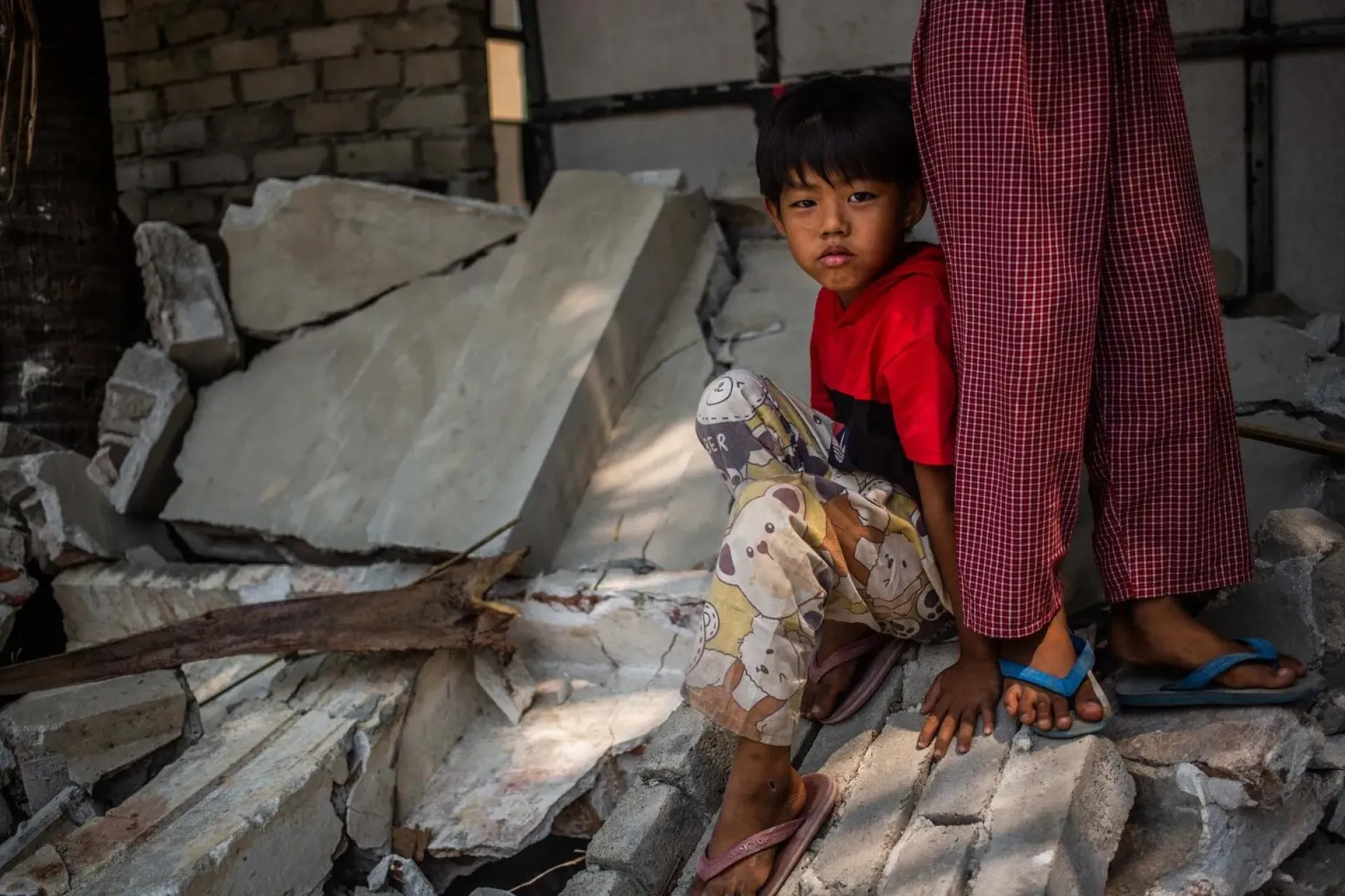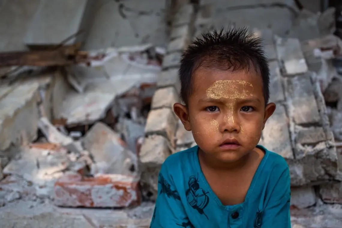 Foto: - UNICEF/UNI772878/Htet Un niño sentado enfrente del muro colapsado de un centro comunitario en Mandalay, varios días después de que un terremoto afectará la región -