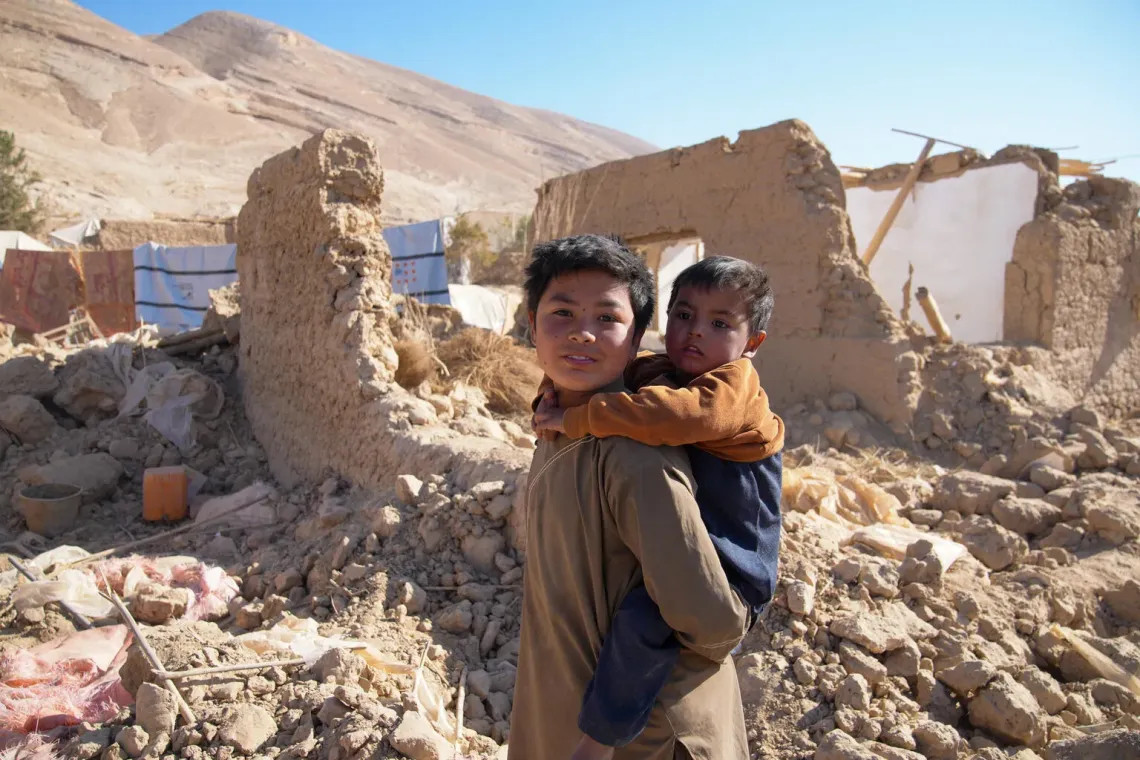 - Foto: UNICEF/UNI909569/Fazel Un niño carga a su hermano cerca de los escombros de lo que era su casa en la provincia de Samangan -