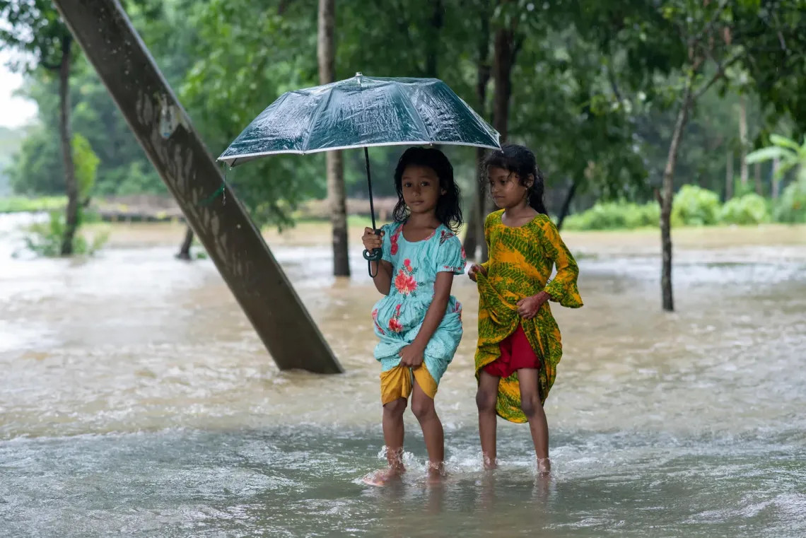 - Foto: UNICEF/UNI830060 Dos niñas atraviesan una calle inundada en Feni, Bangladesh -