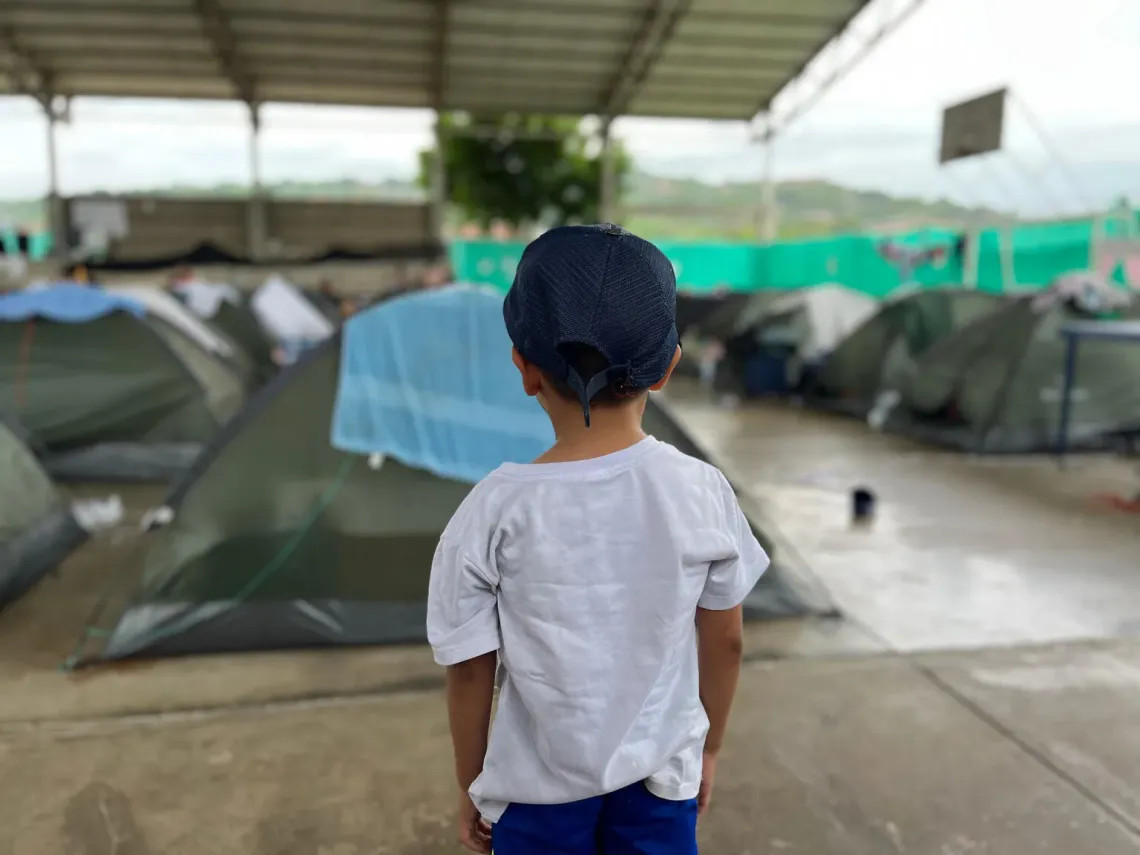 Foto: - UNICEF/UNI844122/Pinedo Un niño observa tiendas de acampar en Cúcuta que son usadas para resguardar a familias desplazadas de la región del Catatumbo, Colombia -