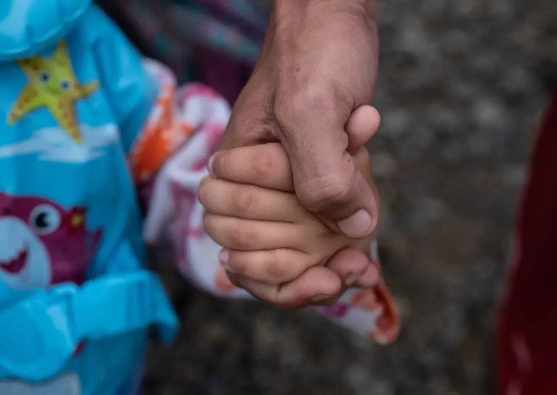 Foto: - UNICEF/UNI684276/Haro Una niña sostiene la mano de su padre después de su paso por la región del Darién al salir de Venezuela -