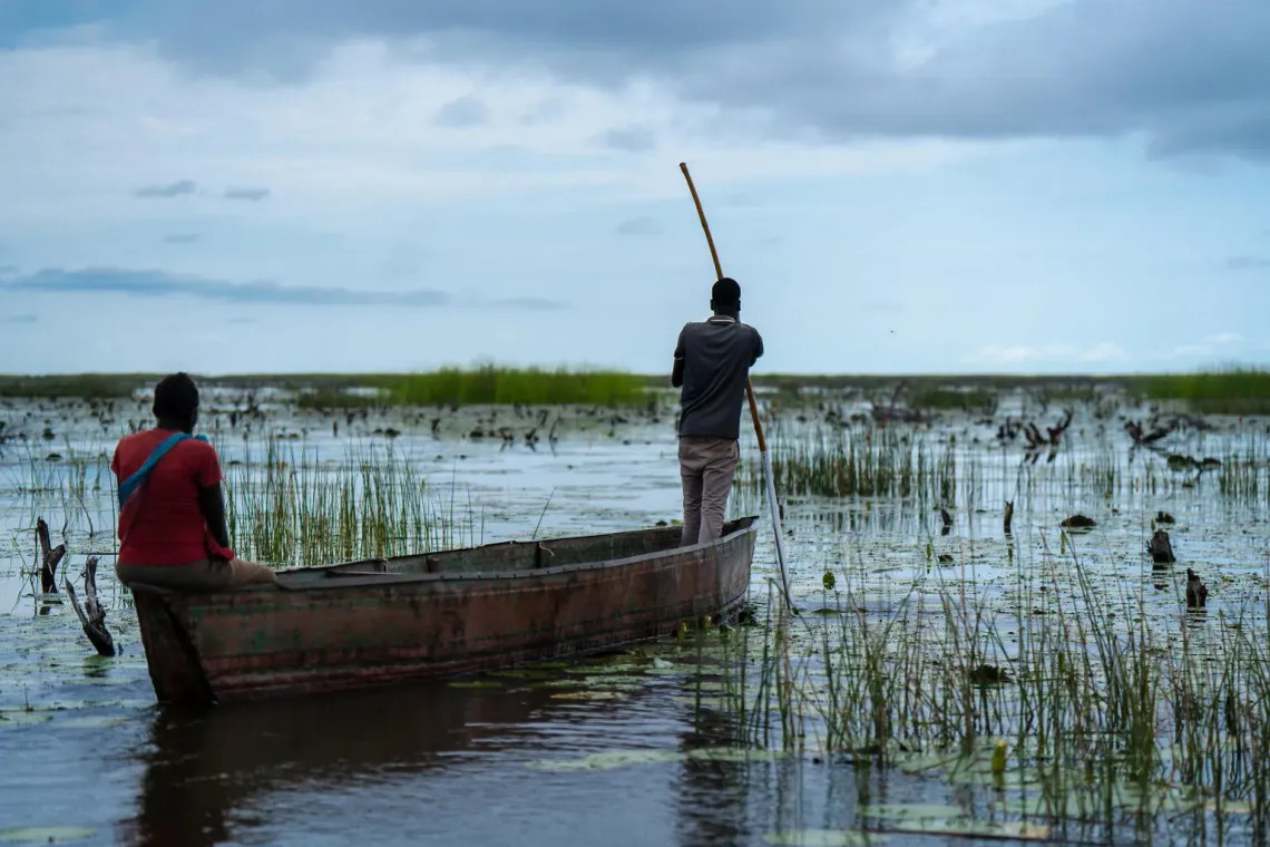 Foto: - UNICEF/UNI896469/Nelson Una mujer sentada en una canoa en medio de un campo inundado en Sudán del Sur -