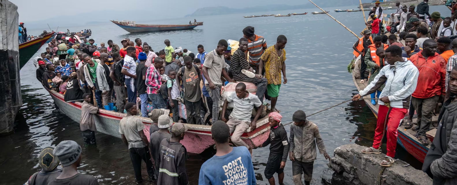Personas que huyen de los combates en las provincias de Kivu Norte y Kivu Sur llegan en bote al puerto de Kituku, en el lago Kivu en GomaMoses Sawasawa - MSF