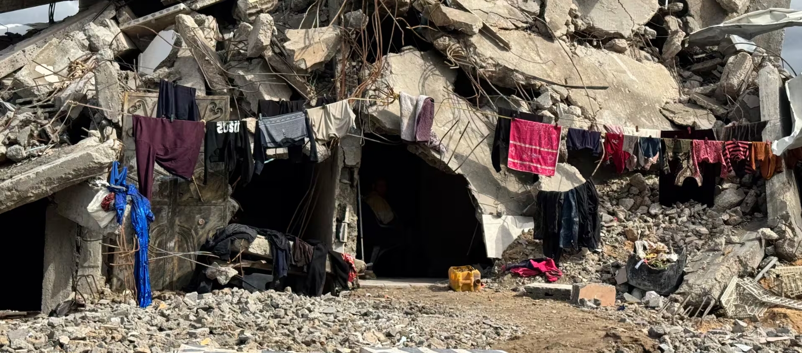 La ropa se seca en un tendedero improvisado que una familia palestina instaló entre los escombros de su casa destruida en Beit LahiaNour Alsaqqa - MSF