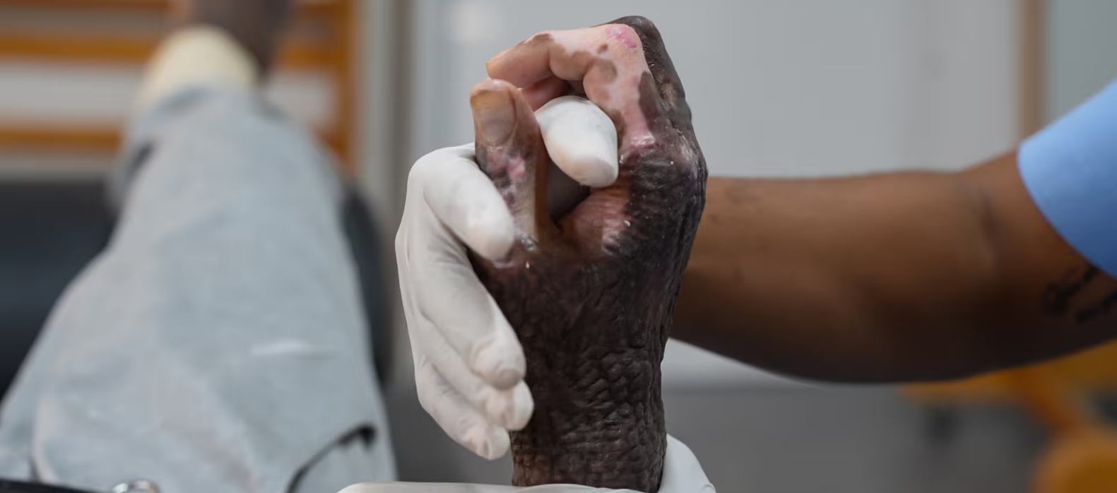 El largo camino hacia la recuperación de los pacientes con quemaduras, un fisioterapeuta moviliza la mano de un hombre durante una sesión de fisioterapia en el hospital de MSF en Tabarre, Puerto PríncipeMarx Stanley Léveillé - MSF
