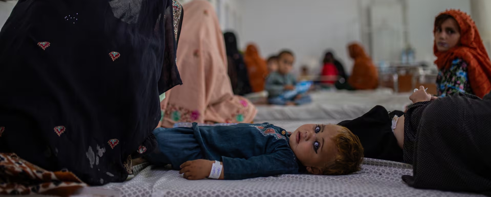 Sediqullah, de un año, yace en la cama junto a su madre, Alizai, de 30 años, Está recibiendo tratamiento en el hospital provincial Boost, en Lashkar Gah, después de haber ingerido accidentalmente unas pastillas y comenzar a sufrir convulsionesTasal Khogyani - MSF