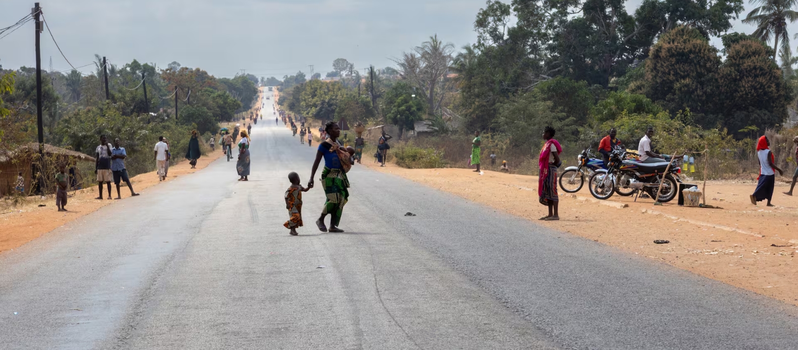 Personas caminan por una carretera en la provincia de Cabo Delgado, una zona que ha atravesado tanto conflictos como desastres naturales, lo que a menudo obliga a las comunidades a desplazarse repetidamente y a enfrentar un trauma constante por la pérdida de sus hogares y medios de subsistenciaMarília Gurgel - MSF