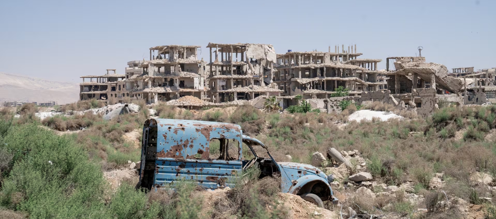 Un auto y varios edificios destruidos por la guerra permanecen abandonados en Hamouriyah, en Ghouta OrientalPhilémon Barbier/Hors Format - MSF