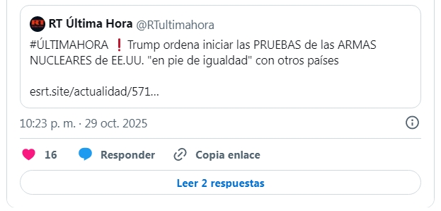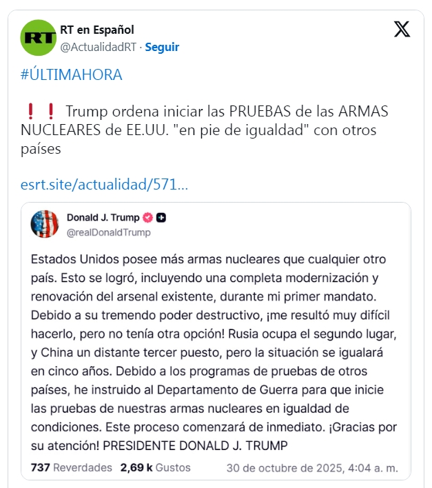 "Debido a su tremendo poder destructivo, ¡me costaba muchísimo hacerlo, pero no tenía otra opción! Rusia ocupa el segundo lugar, y China un lejano tercer puesto, pero estarán igualados dentro de cinco años. Debido a los programas de pruebas de otros países, he ordenado al Departamento de Guerra que comience a probar nuestras armas nucleares en igualdad de condiciones", manifestó., agregando que "ese proceso comenzará de inmediato".