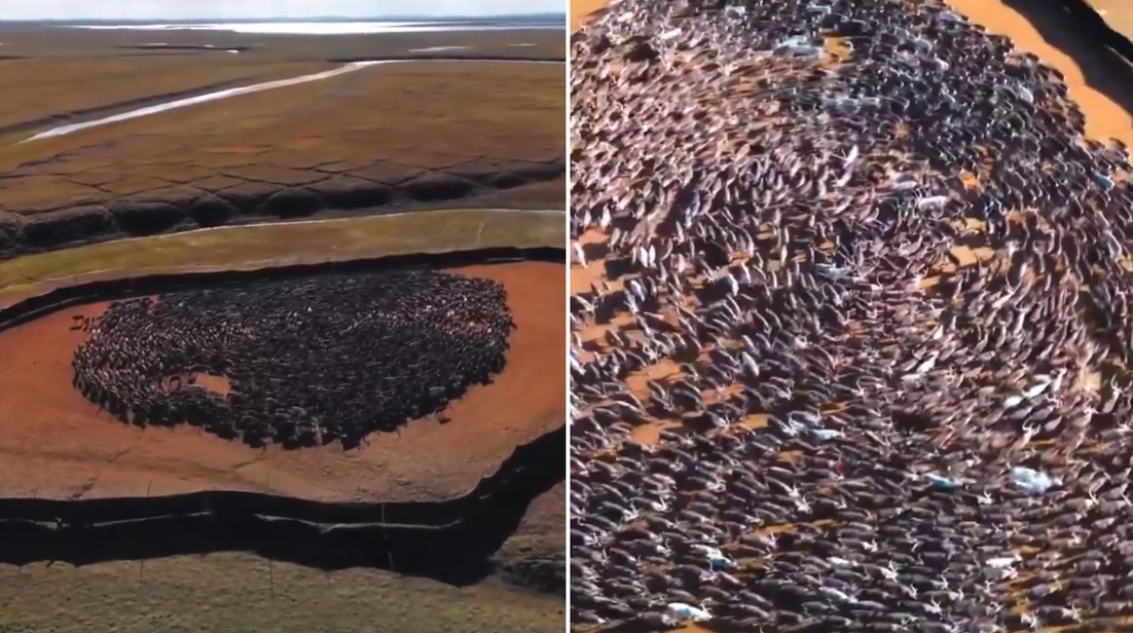 Un hipnótico remolino de renos fue filmado desde el aire en la región de Yakutia, Rusia. En las imágenes se observa como cientos de renos se mueven en círculos, creando una formación que parece casi coreografiada. Se cree que este comportamiento colectivo, que ha sido documentado en distintas ocasiones, les sirve como mecanismo de defensa, aunque...